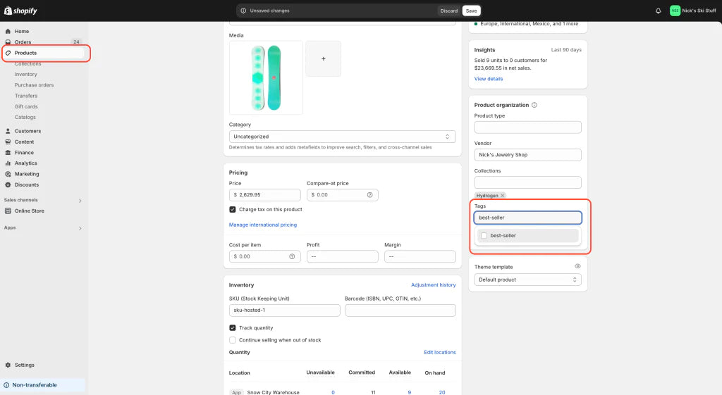 Now before we can show this badge, we need to add the tag to our products so our code knows when to display it. In the dashboard navigate to 'Products' and click into whichever product you'd like and under the 'tags' area, add 'best-seller'.