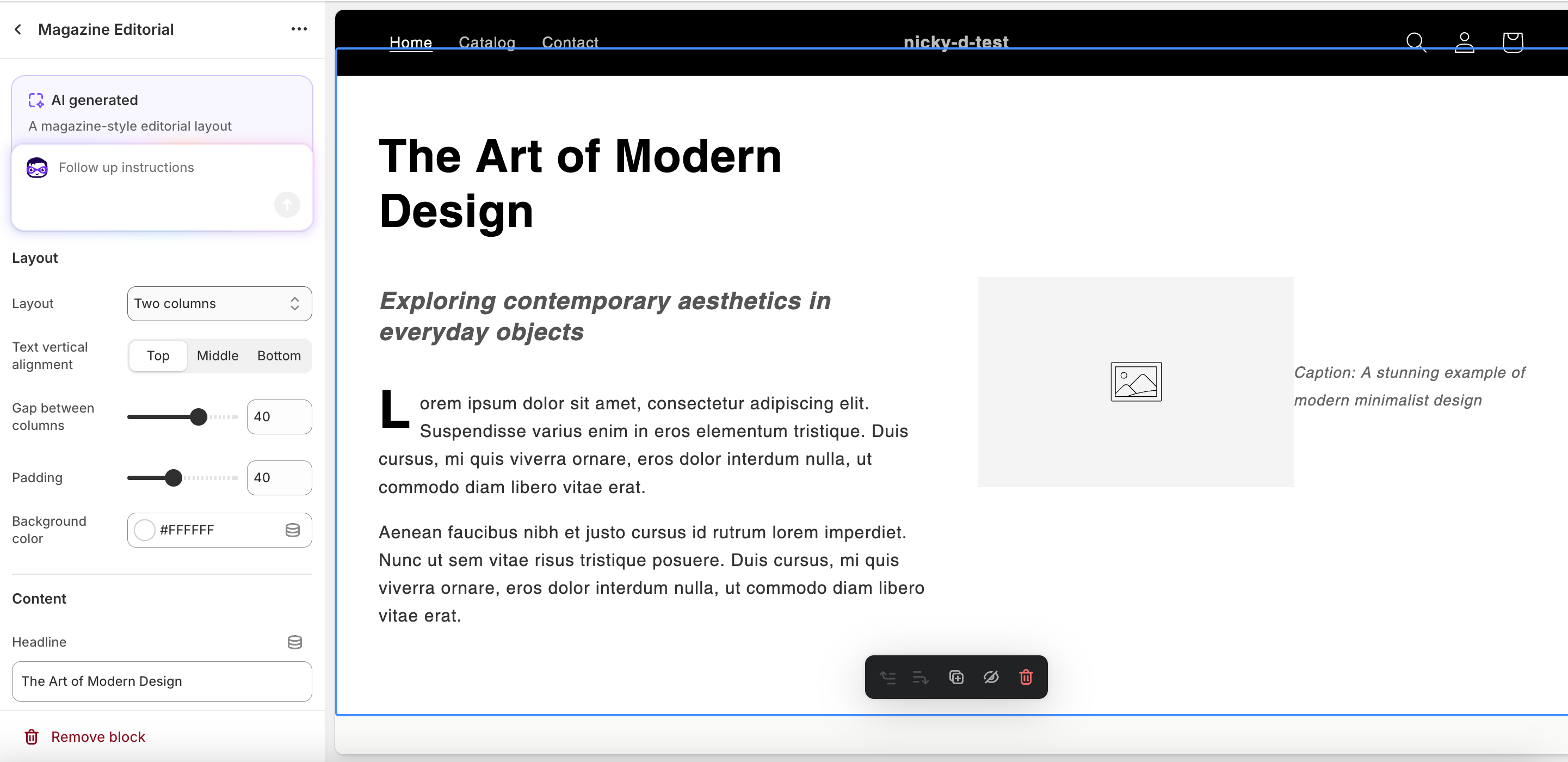The AI-Powered Theme Block Customizer is a cutting-edge tool that leverages artificial intelligence to help merchants create and customize their store themes with unprecedented ease and efficiency. This feature allows users to modify various aspects of their theme blocks, ensuring that their online presence is not only visually appealing but also aligned with their brand identity.
