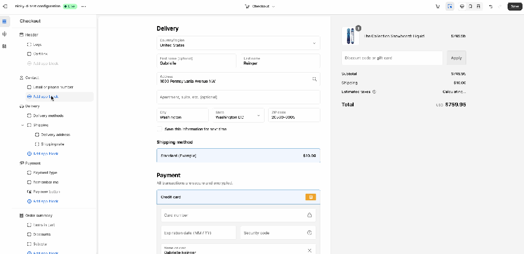 Now that we have our code in place, let's add our extension in the theme editor to see how it looks. To do this, first ensure that your server is still running and then open our browser back to our theme. Navigate to 'Settings' in the bottom left corner and then click 'Checkout'. This should open up the theme editor where we can click 'Add block' to insert our newly created extension.