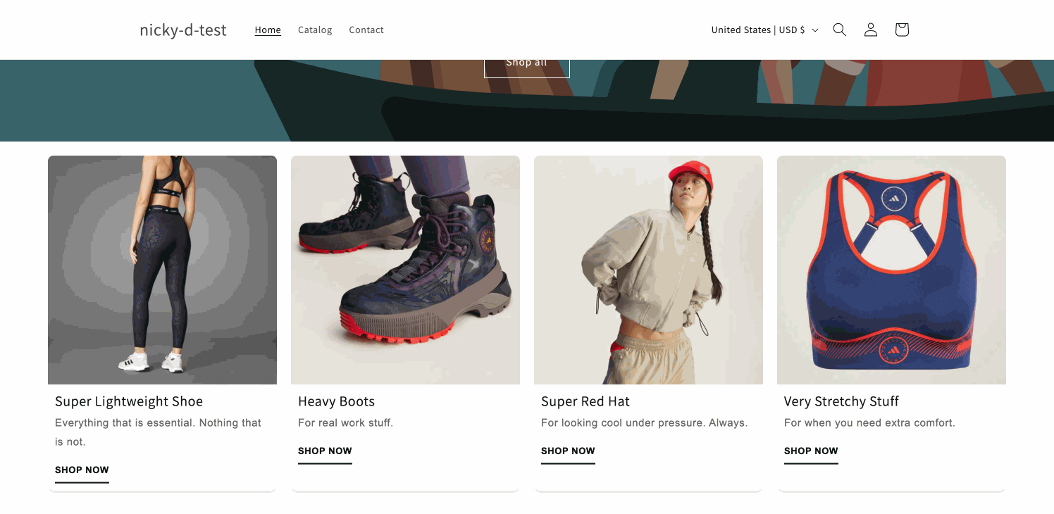 The Adidas section we will create consists of a grid of product cards, each featuring an image that changes at a specified interval. This design allows customers to see different angles or variations of a product without needing to click through multiple images. The section is built using Liquid, Shopify's templating language, along with HTML and CSS for styling.