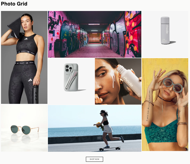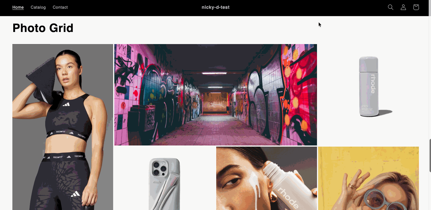 This guide will walk you through adding a beautiful, customizable photo grid section to your Shopify theme. This section features a fixed 8-image layout with a mix of vertical, horizontal, and square images that automatically arrange into a perfect rectangle.