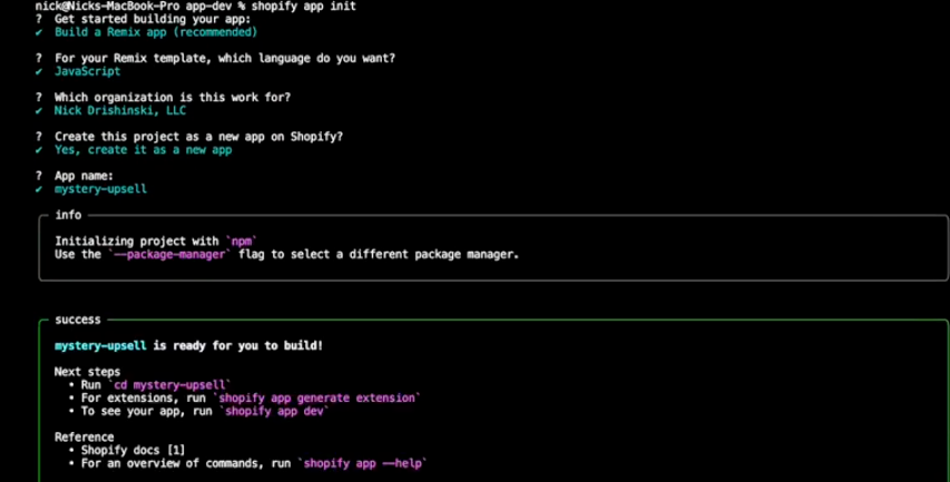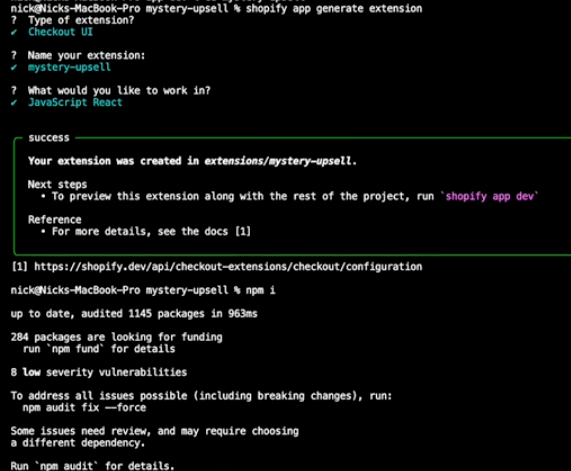 Now that our app is created, we can `cd mystery-upsell` and run `npm i`.